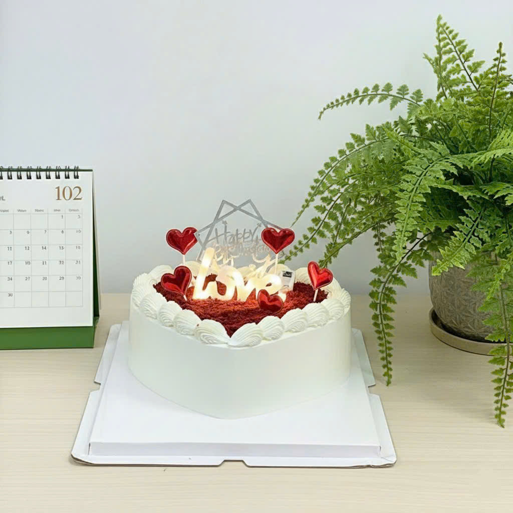 Bánh kem sinh nhật hình trái tim có gắn chữ LOVE